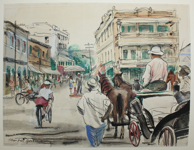 Spenser, E R. Watercolour of Front Street, Hamilton. 39 x 26.5cm probably from the 1950's. A reminder of a peaceful time in history before rampant development. |