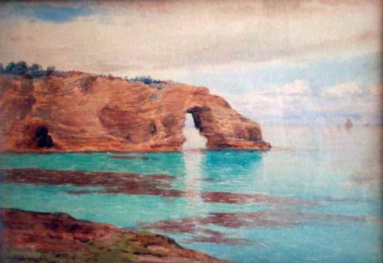 Wedlake, Wallace. Boulders on South Shore.oil on canvas. dated 1889. dimensions 44 x 35.5 cms This artist actually came to Bermuda to take up employment as a church organist. In the course of his stay he accomplished a number of paintings including this winter scene with lowering sky and forbidding rocks. |