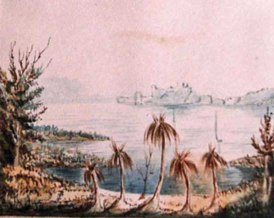 Scott, Captain Andrew. St. Georges from Convict Bay. c 1857. watercolour. 6 1/2 x 3 1/2 inches. With Ordnance Island and well remembered buildings hugging the shore. Observe the fine stairway on the left and the fort which now houses Bermuda Search and Rescue operations standing proudly at the top of the hill. |